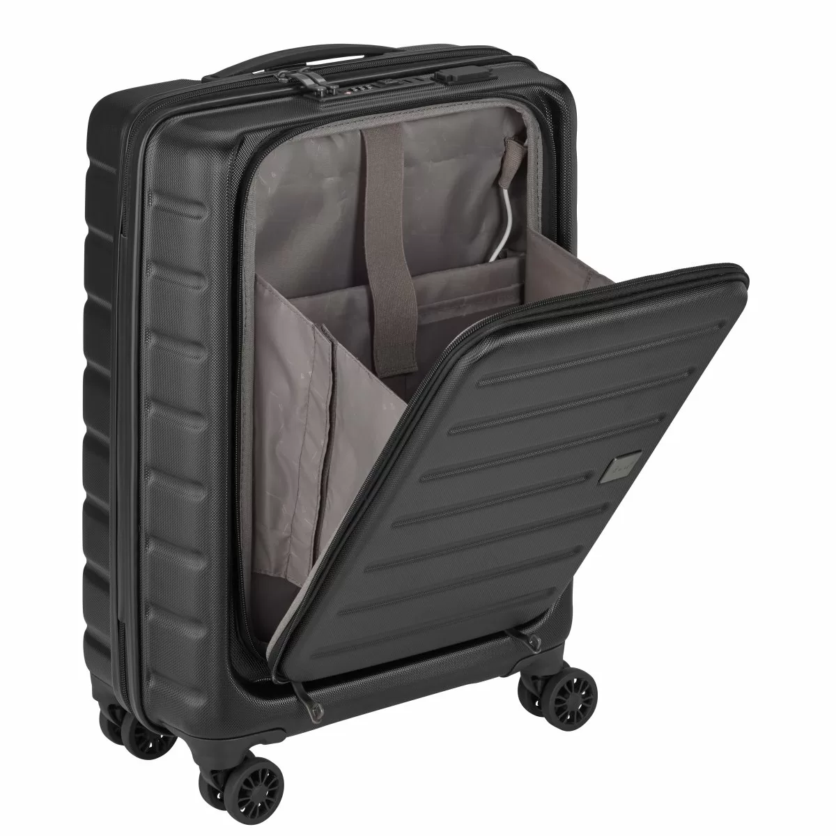| Bordgepäck / Business Trolley 55 cm aus robustem ABS Material. Vortasche mit Laptopfach lässt sich separat öffnen. TSA Schloss mit Doppelfunktion, Anschluss für USB Powerbank, mehrstufiger Teleskop-Trolleygriff und Tragegriff. Innenausstattung mit Mehrfacheinteilung und Gepäckband, Wäschefach und Innenfach mit Reissverschluss. |