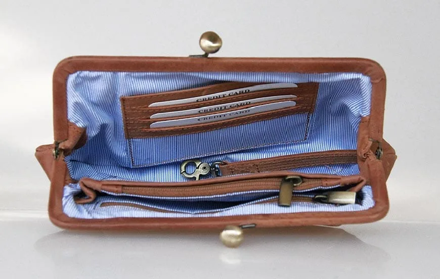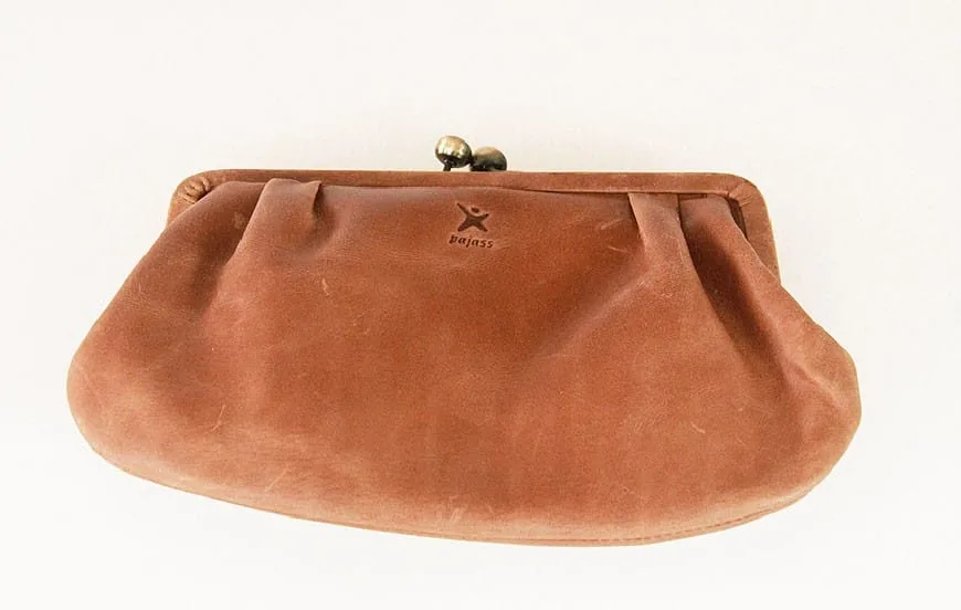 Details: Exklusives ECO-Leder, handgefertigt in einem Sozialprojekt. 2 Fächer mit Reissverschluss, 3 Kreditkartenfächer, eleganter Bügelverschluss,