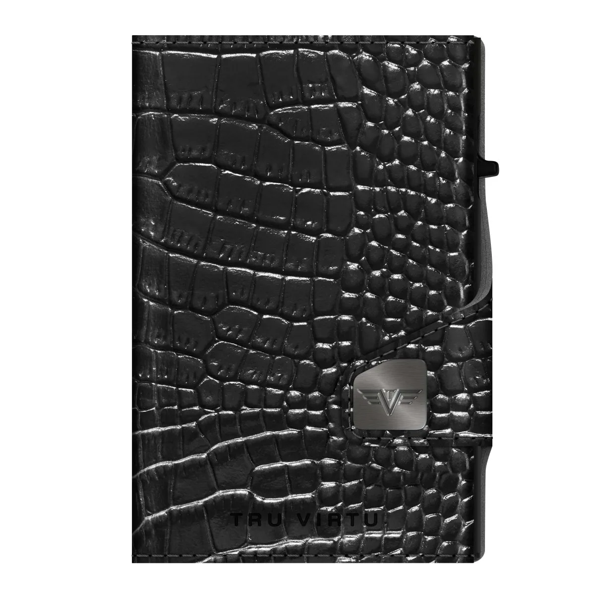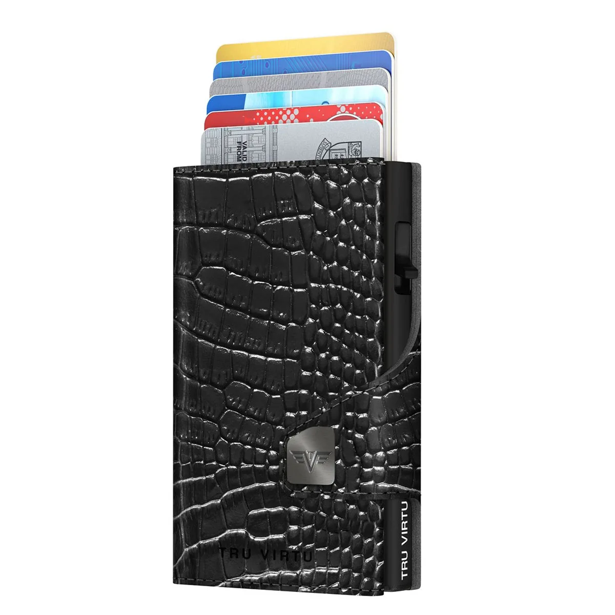 Das TRU VIRTU® CLICK & SLIDE Doublewallet besteht aus zwei Aluminiumcases, umhüllt in einer Lederhülle aus feinstem Italienischem Leder mit Druckknopfverschluss. In den Aluminiumcases finden bis zu 10 Karten (pro Alu-Case: Mix aus max. 4 geprägten und 1 glatten Karte) einen sicheren Platz und sind dank der soliden Aluminiumhülle zuverlässig gegen unbefugtes Auslesen von RFID-Chips geschützt. Das Innere der Lederhülle bietet zudem Raum für bis zu 6 zusätzlichen Karten, Geldscheine, Kassenbelege und Visitenkarten. Ideal für Besitzer von einer höheren Anzahl an Karten. Made in Germany.