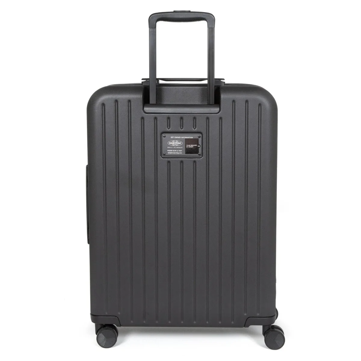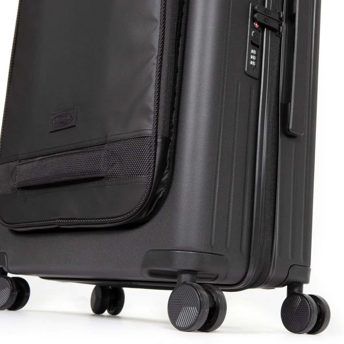 Hartschalen-Reisetrolley von Eastpak aus der CNNCT-Kollektion. Zwei Fächer mit Reißverschlusstasche vorne. Hergestellt aus 100 % Polyester (100 % veganes Produkt, hergestellt ohne Verwendung tierischer Produkte). Teleskopgriff, 360-Grad-Drehräder und integriertes dreistelliges TSA-Codeschloss.