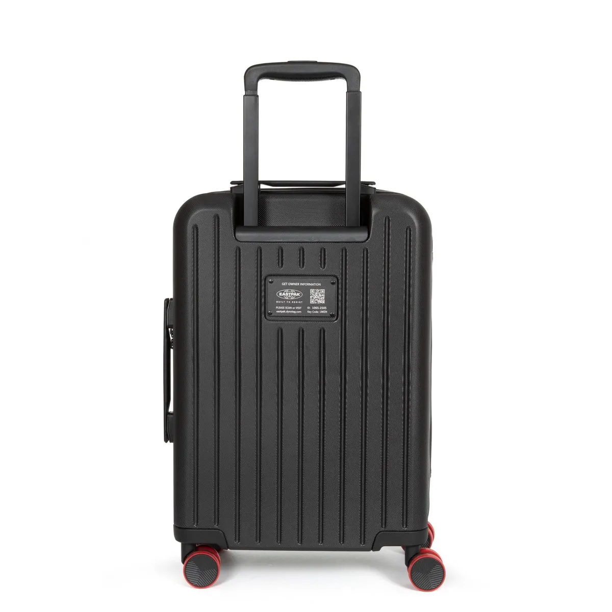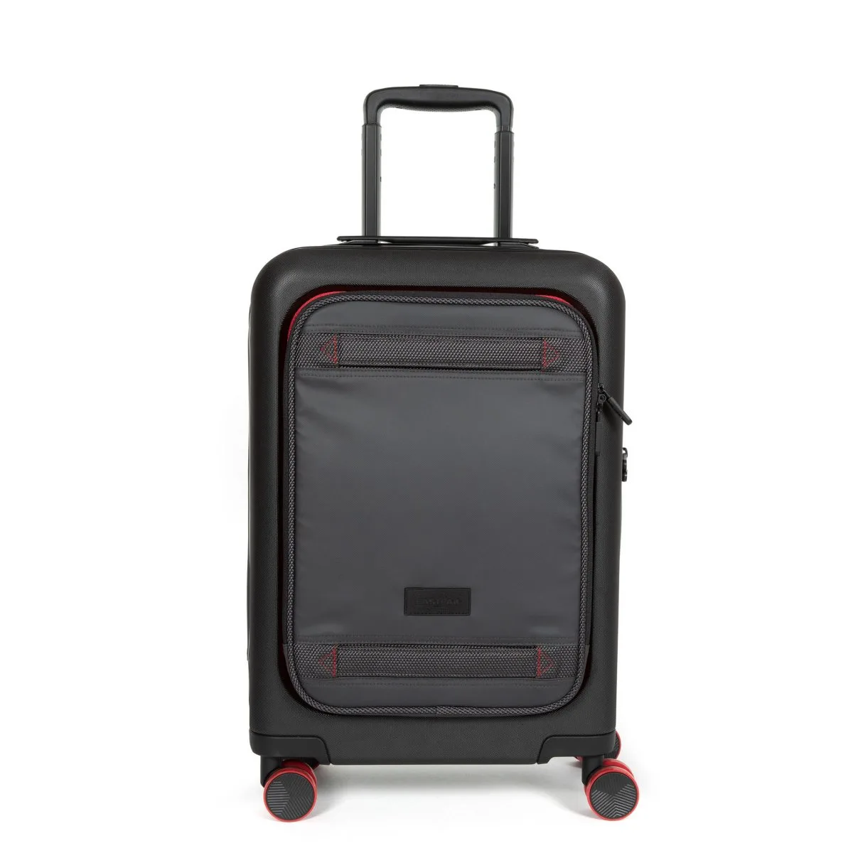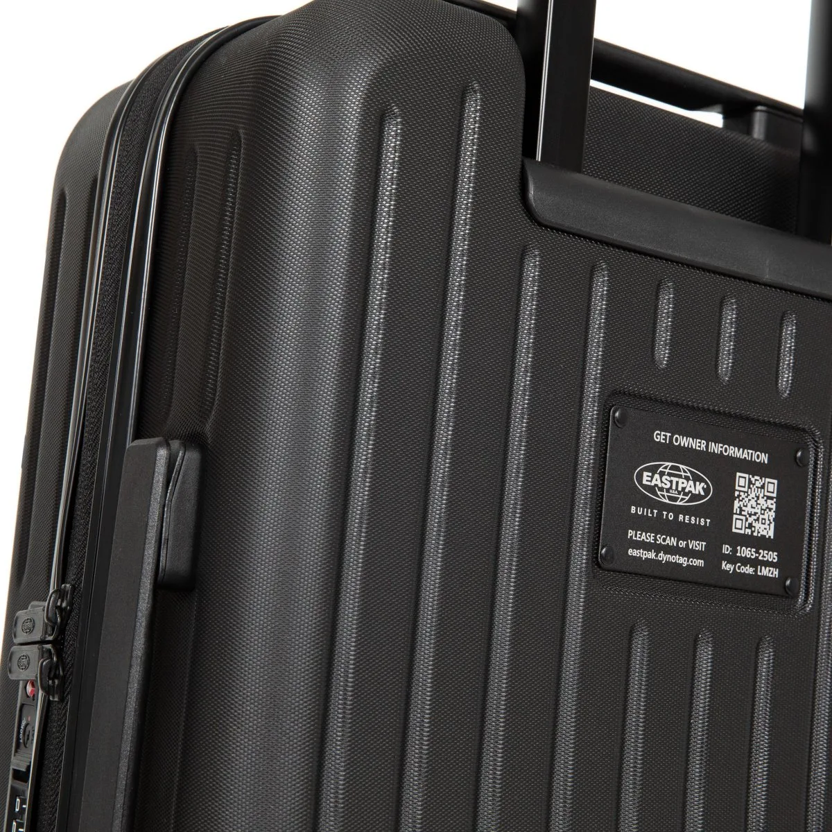 Hartschalen-Reisetrolley von Eastpak in Kabinengröße aus der CNNCT-Kollektion. Zwei Fächer mit Reißverschlusstasche vorne. Hergestellt aus 100 % Polyester (100 % veganes Produkt, hergestellt ohne Verwendung tierischer Produkte). Teleskopgriff, 360-Grad-Drehräder und integriertes dreistelliges TSA-Codeschloss, gepolstertes Laptopfach zum Verstauen der meisten 13-Zoll-Geräte.