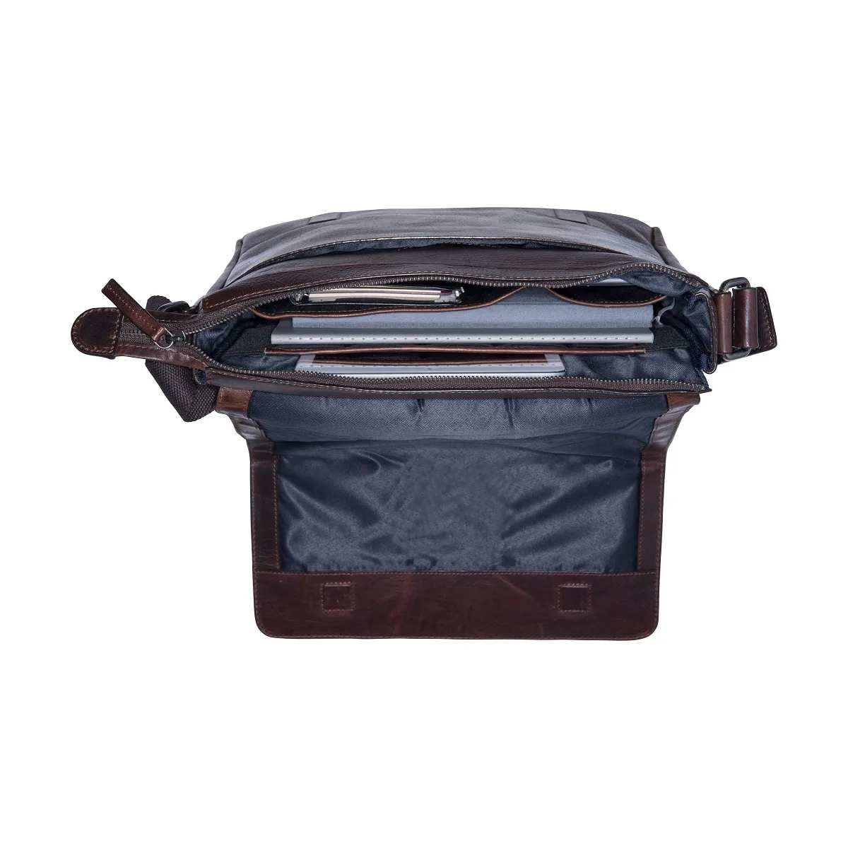 Praktische und elegante Umhängetasche von Leonhard Heyden aus robustem Leder mit gepolstertem Laptopfach bis 13″ und verstellbarem Umhängeriemen. Die praktische Tasche verfügt über ein Hauptfach und mehrere Nebenfächer für Wertsachen, Handy, Stifte und anderes.