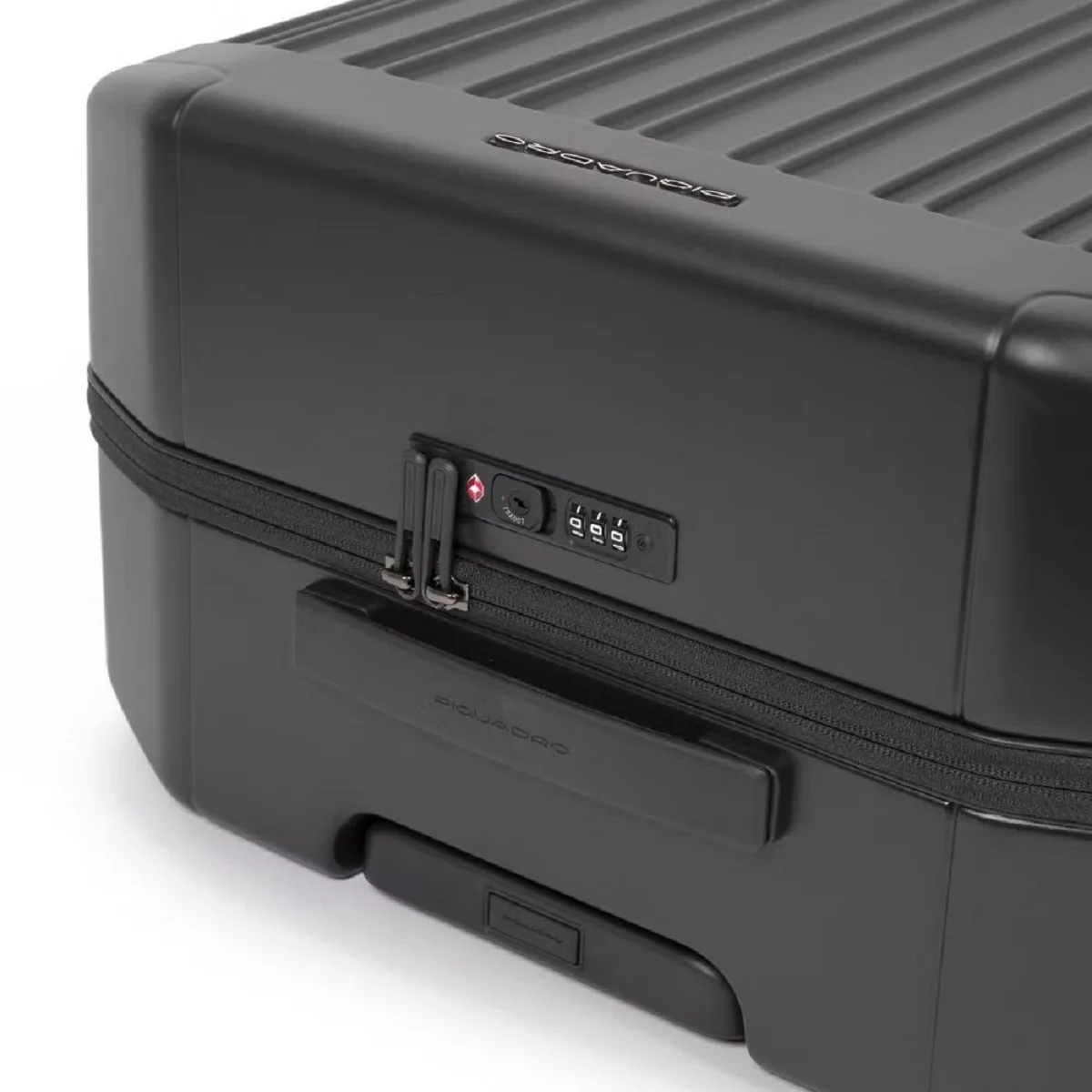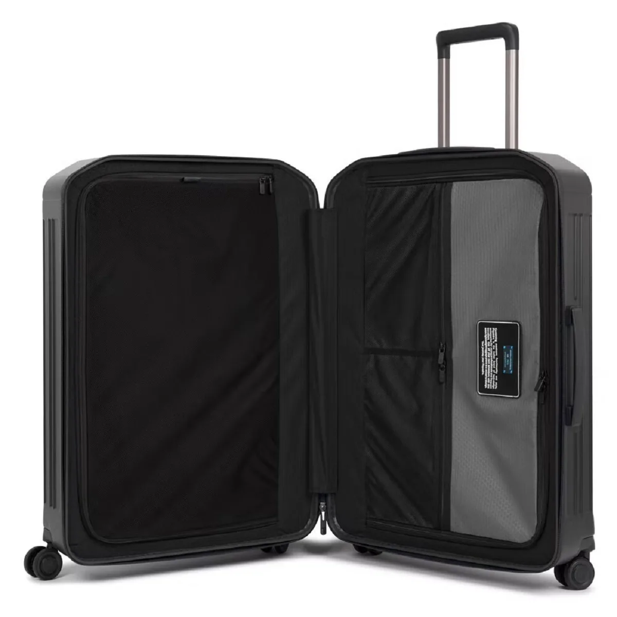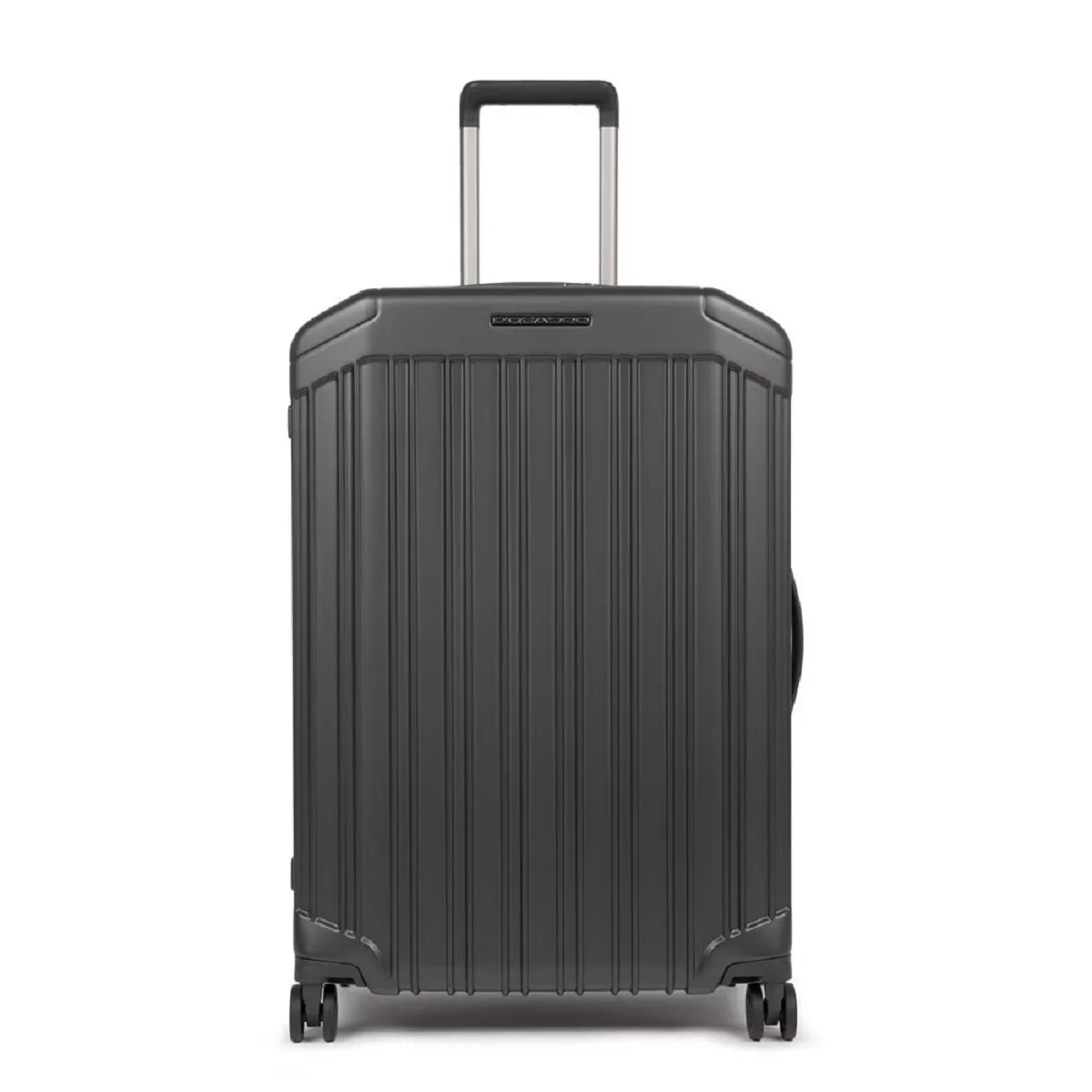 Hochwertiger Trolley von Piquadro der PQ-Light Serie aus robustem Polycarbonat in stylischem Design. Der Trolley bietet durchdachte Funktionalität und viel Stauraum mit einem geräumigen Hauptfach und separat bepackbarem Wäschefach. Vier leise und leicht zu manövrierende Rollen.