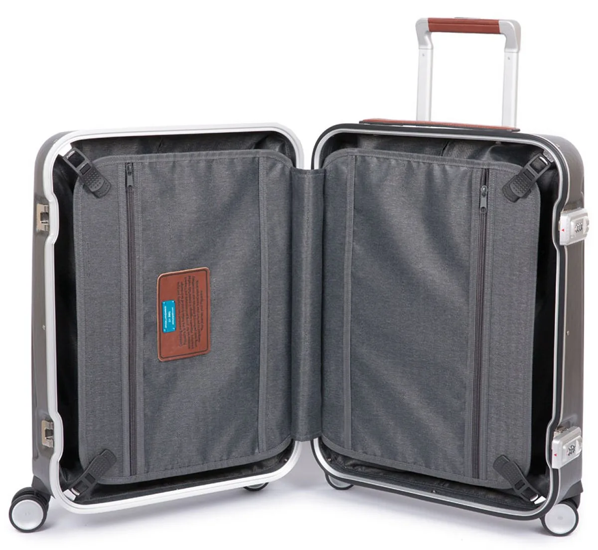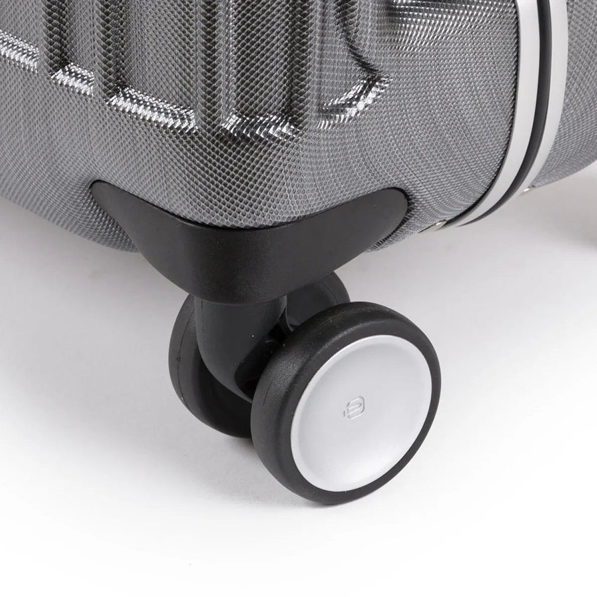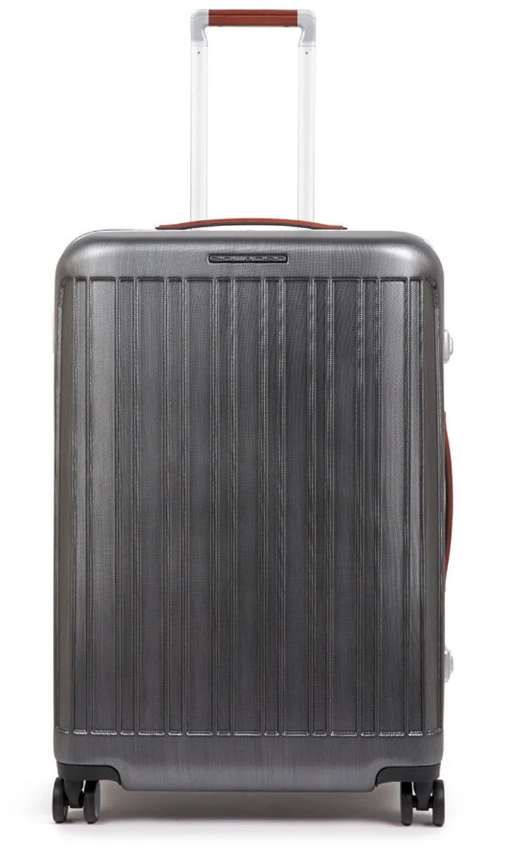 Die Linie Relyght Plus von Piquadro richtet sich mit einem edlen Produkt mit modernsten Materialien an den Business-Verbraucher. Die Serie wird aus robustem, kratzfestem Polycarbonat im Metallic-Look mit Flammungen hergestellt. Das Trolley-System mit Alu-Griff und Innenfächern wird mit Leder-Einsätzen optisch aufgewertet.
