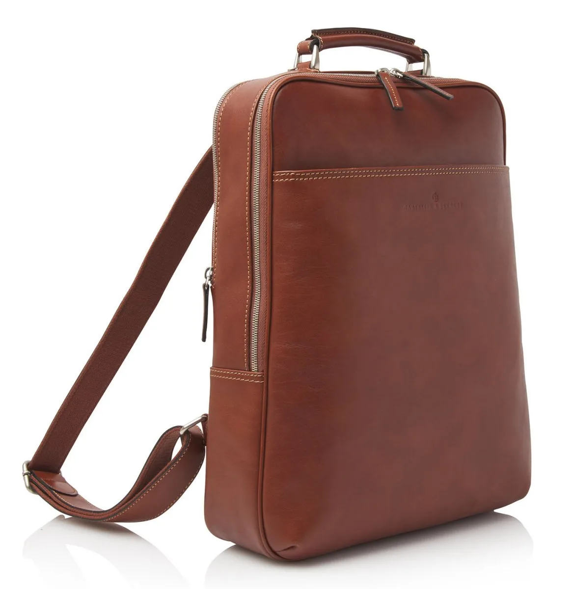 Dieser stilvolle Lederrucksack hat einen bequemen Griff und verfügt über ein verstärktes 15,6-Zoll-Laptopfach und Tabletfach, diverse Reißverschlussfächer und ein praktisches Organizerfach für Smartphone, Kugelschreiber, Visitenkarten usw. Im speziellen RFID-Reißverschlussfach sind Ihre Bank-, Kreditkarten und der Ausweis vor Skimming geschützt. Zusätzlicher Tragekomfort dank der verstärkten Rückseite und stabiler, verstellbarer Schulterriemen aus Leder. Das Smart-Sleeve ist die Lösung, wenn Sie den Rucksack auf einem Trolley mitführen möchten. Gefertigt aus hochwertigem, italienischem Rindsleder.