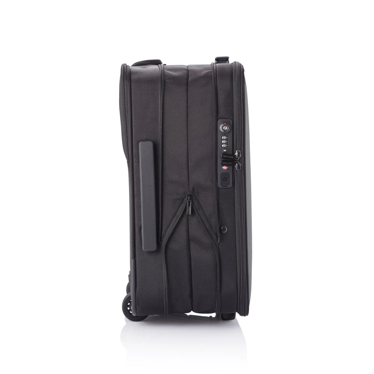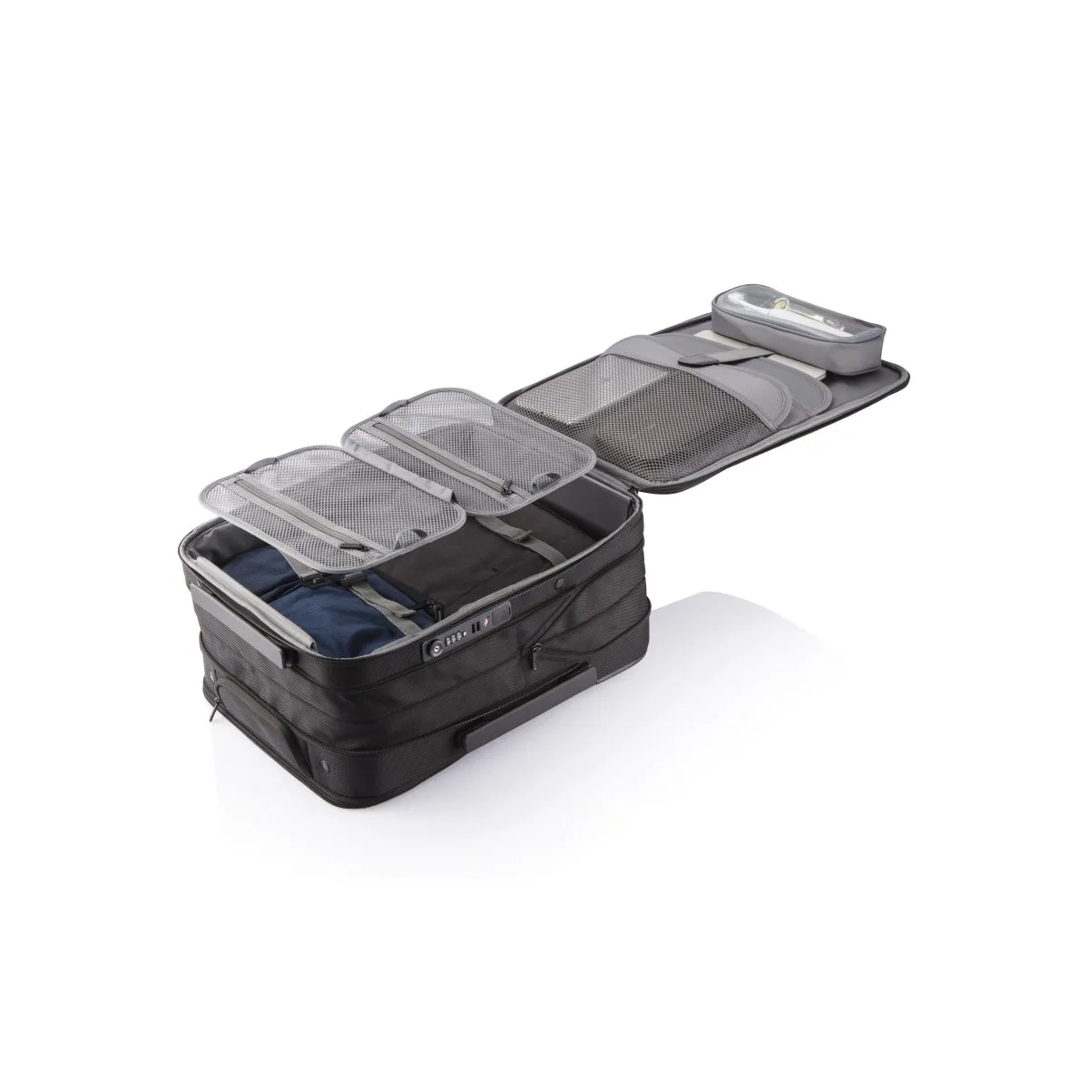 Der Foldable Trolley von XD Design ist der erste seiner Art. Dieser Trolley kann mit nur wenigen Handgriffen vom Handgepäck zu einer tragbaren Aktentasche umgeformt werden. Dank dem erweiterbaren Design lässt sich das Fassungsvolumen um 50% erhöhen. Sehr praktisch ist zudem auch der direkte Zugriff auf das 15.6″ grosse Laptopfach und das integrierte Necessaire. Dies ermöglicht beim Zoll am Flughafen ein schnelles und unkompliziertes passieren. Die Flüssigkeitstasche kann mit einem Magneten befestigt werden. Im Inneren verfügt der Koffer über ein Organisationsbrett zur Aufbewahrung kleinerer Gegenstände und zum Komprimieren der Kleidung, magnetischem Klicksystem und verstellbaren Gurten. Zusätzlich besitzt der faltbare Flex-Trolley mit den üblichen XD Design Features, wie das unverwechselbare Anti-Diebstahl-Design ohne Frontzugriff, versteckte Taschen, ein integriertes TSA-Schloss und einen USB-Ladeanschluss. Der Trolley wurde zudem aus RPet gefertigt.